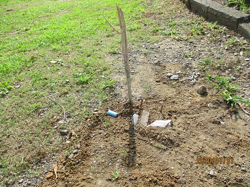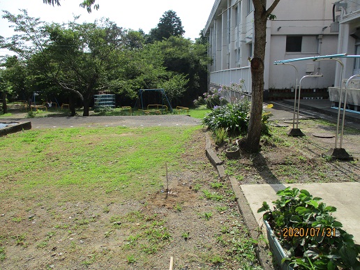 |   | 7月31日午後、3年生の体育授業中、体育館の中に迷い込んだ(?)鳥が窓か何かにぶつかって、落ちました。授業の後、3年生の心優さん,心奏さん,拓也さん,喜将さんたちが、「可哀想だから埋めてあげる。」と言ってお墓を作ってくれました。 カワセミだと思いますが、こんなきれいな鳥が飛んでいて事故に遭うのが、すぐ身近におこるなんて、自然の豊かな牧之原小学校だなあとあらためて思いました。
