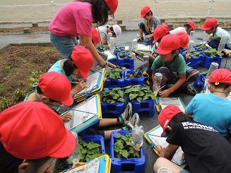 |   | 葉っぱの形がかわったよ 5月に植えた朝顔の種は順調に生育しています。子どもたちは、毎朝、朝のカバンの支度が終わると「朝顔の様子を見にいってきます。」と水をかけたり、様子を見たりしています。 6日(木)には、観察をして観察カードに記入しました。その際、来週の月曜には間引きをするよという話をしました。月曜に5本植えたもののうち2本だけ残し、後は抜いてしまいます。抜いたうちの1本を持ち帰ります。お便りにも書きましたが、持ち帰る際に使う牛乳パックを持たせてください。よろしくお願いします。