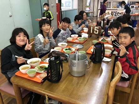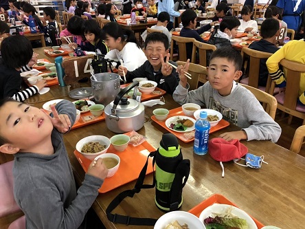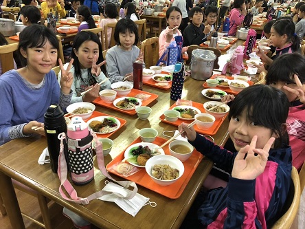 5年生の観音山自然体験教室2日目、おいしい食事の様子です。
