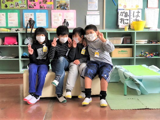 最後に、かわいいかわいい、かがやき1組さんの集合写真です。  みんなで仲良く長いすに座っていたので、カメラを向けたらみんなでピース! 風邪予防のマスクをしているのが残念・・・でも、マスクは大事ですからね! 「子どもは風邪の子」にならないよう、気をつけましょう!