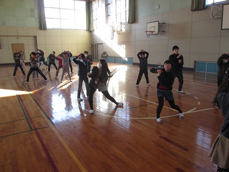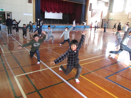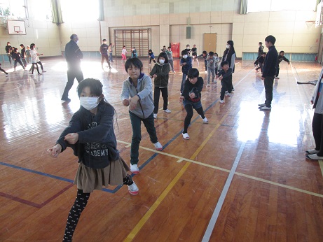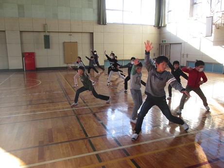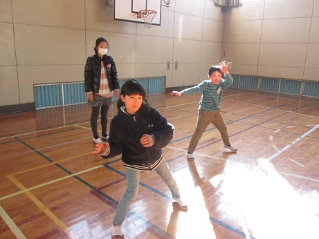4年生もあと少し。これは、少し前の映像ですが、体育館で6年生に伝統の協力平を指導してもらっているところです。