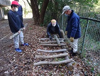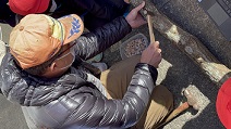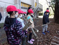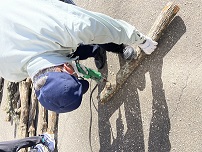 「樹皮と種駒が同じ高さになるように打ち込む」「種駒を下に落とすと地面の雑菌が付くから気をつける」など教えてもらい、友達と木をおさえながら行いました。みんな、トンカチ上手に使ってましたよ。
