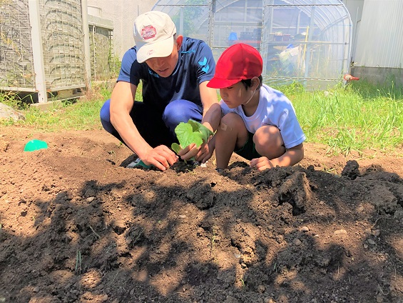 野菜の苗を植えてからしばらく経ちました。 あれから支柱を立てたり、毎日水やりや草取りをしたりと大切に育てています。 美味しい野菜ができるといいね!