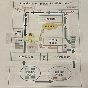 事前調査結果にもとづき、自家用車に色別表示札を掲示して決められた経路に進み、各教室やランチルームで引き渡しをしました。