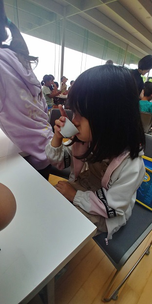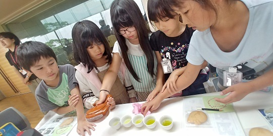 最初に、お茶の品評会の見学をしました。同じ緑茶に見えても、子供たちは茶葉の形や色の微妙な違いに気づきました。