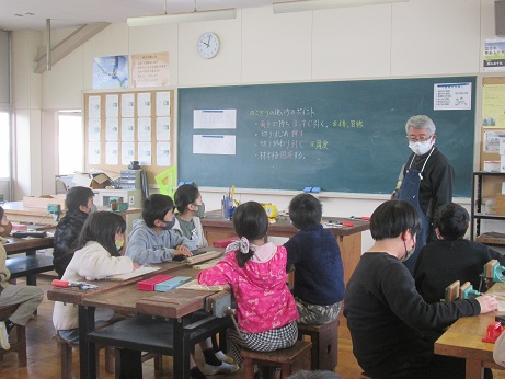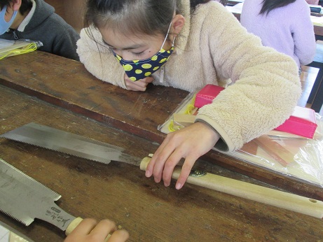 |   | 今日の図工はいつもと違う雰囲気でした。 中学校へお出かけし、技術の先生にのこぎりの使い方を教えていただきました。