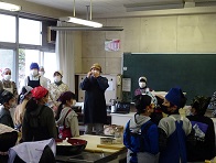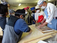 そば粉からそばを作る機会なんてないですよね。各班に入っていただき、一緒に全工程を進めてくれました。生地を伸ばして、畳み、切っていきます。切るのは、見本を見せてもらうと簡単そうに見えるのに、やってみると包丁を斜めにするのも、動かすのも難しくて、うどんのように太くなってしまう子が多かったです。もちろん、私も...。
