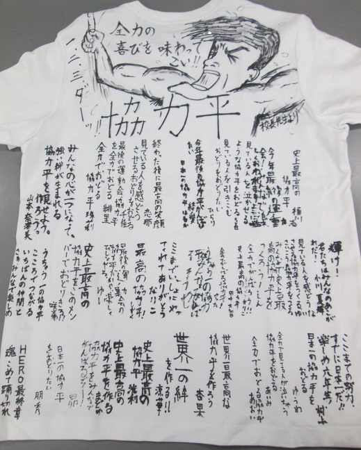当日、担任が着ていたTシャツには6年生の協力平への熱い思いと、先生達からの応援メッセージが書いてありました。 書いてある願いや思いが実現されて本当によかった。 6年生の感想にも、「仲間と心が一つになっていた」「今まで仲間と頑張ってきてよかった」と、この集団の絆を感じる言葉があふれていました。 頑張ってよかったよね。よくぞやり抜いたね。