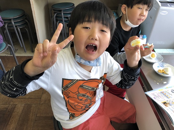 *4月26日 ゆでたまごをつくろう*みんなでゆでる時間をきめて、ゆでたまごをつくりました。