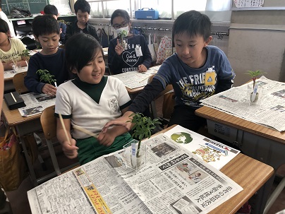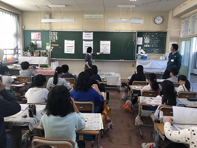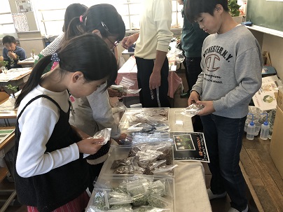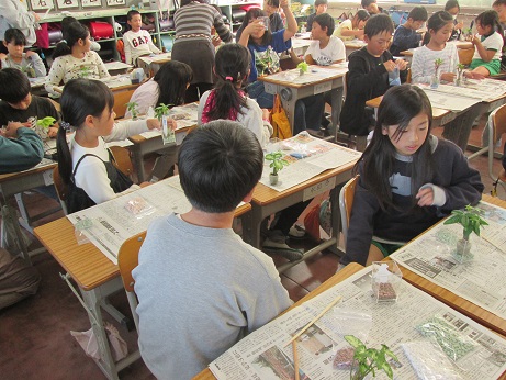 5時間目は、矢崎部品物作りセンターの方が来てくれて、リサイクルの話をしてくれました。ガラスをリサイクルした物で、植物の土の代わりになるそうです。