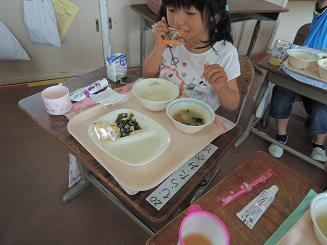 |   | ハンバーグVSさけのムニエル ~あなたはどっち?~ 今日はセレクト給食でした。ハンバーグとれいとうピーチのセット、もう一方はさけのムニエルとれいとうパインのセットでした。1か月以上も前に希望をとったのでもう自分の選んだ物を忘れているかと思っていたら、子どもたちは結構しっかり覚えていました。1年は12対11と僅差ながらハンバーグを希望した子が多かったです。希望しただけあってハンバーグとムニエルはあっという間に食べてしまっている子が多かったです。その横で海藻サラダにはあまり箸がすすまないようでした。