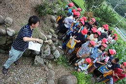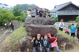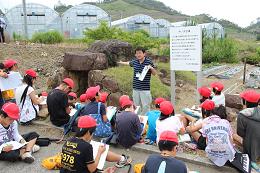 自分たちがつくった勾玉を首にかけ、牧之原にある古墳や山城跡を見学に行ってきました。