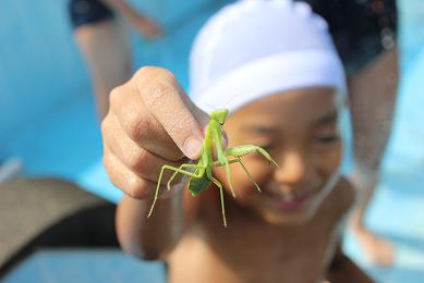 また、プールサイドでかまきりも水浴びに来ていました