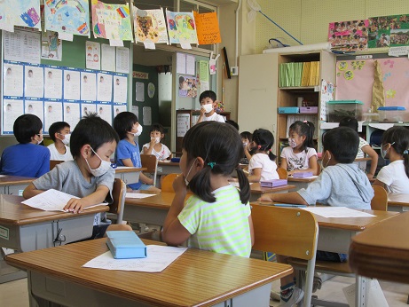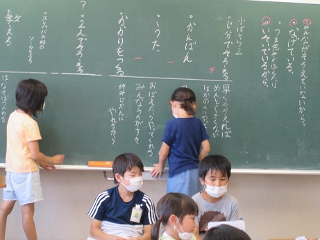 だいぶ出遅れたのですが、トイレのスリッパ問題を2年生も真剣に考えていたので紹介させてください。2年生は話合い活動をすごく楽しみにしてやる気いっぱい取り組めるところがうれしいし、かわいいです。司会や書記といった司会団もほとんどの子が立候補しちゃうくらいのやる気なんです。司会の2人は相談しながら、「先生の力なんぞ借りまい!」とまっすぐみんなの方を見て話しました。黒板書記の2人は、交替で発表を聴きながら、国語で学習したメモの取り方を使いながら端的に書記をしていました。ノート書記の子は、黒板を写すだけでなく、発表した子の名前を全て記入してありました。そして、みんなもよーく考えました。司会の子は最後も、「納得できない子はいない?」と気にかけていて、担任はほれぼれしました。なんだかこの1時間がすごすぎて、話合い活動が楽しみになりました。司会団も「楽しかった!次はいつやろう!」だって。うれしい。次の司会に立候補してる子も「はやくやってみたいな。」だって。うれしい。ちなみに2年生は「うたをつくる」でした。理由は、「牧小のみんなはうたが好きだから、スリッパをせいとんする歌を作って、覚えて、スリッパをせいとんしたいから。」だそうです。おどりを作る、スリッパのお部屋を床に書く、とかも出ました。おもしろいな2年生!