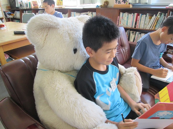 図書室には9月からソファが入りました。大きなぬいぐるみの中で楽しそうに本を読んでいました。