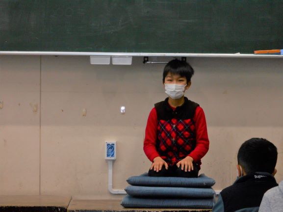 |   | 国語に「古典芸能の世界ー語りで伝える」の学習があります。落語について知り、親しむ学習です。事前に落語の特徴を確認しました。そして、短い1分でできる落語を各自練習してきました。 そして、本日、本番、ざぶとんに座り、落語を語りました。ちょっと照れながらも楽しく発表し合いました。 発表会のあとは、「落ち」についてみんなで確認し、落語の効果的な表現と笑いについて考えました。